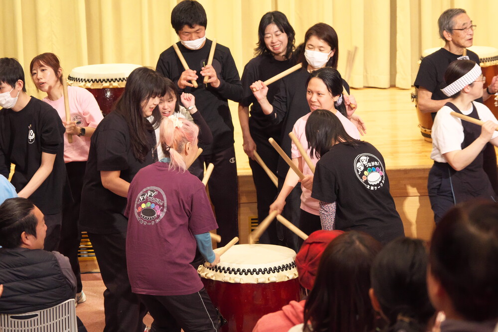 おもしろそう!障害が重い子でもできるかも!という理由で、経験者も指導者もいないのに越谷養護学校(当時)の児童生徒とその保護者、教員で和太鼓サークルを結成してからちょうど三年目に、初めて荒馬座の舞台を観ました。もっと早く知りたかったと、心底後悔するほど荒馬座の舞台は衝撃的に素晴らしく、きっとそのときから荒馬座の応援はライフワークになったのだと思います。 「荒馬座を応援したい。荒馬座、民族芸能の楽しさを多くの人に知ってもらいたい」「障害者たちの晴れの舞台をつくりたい」という個人的な思いが、「荒馬座の公演・講座・ワークショップをさいたま市・周辺地域で開催し、サークルを活性化させたい!」という、サークルやみんなの目標に結びつきスタートした笑顔咲く春まつりでした。 第一回『笑顔咲く春まつり』が開催されたのは二〇一三年四月。第三回までは隔年での開催でしたが、第四回以降毎年開催となり、今年第十回目の節目を迎えました。この企画は、第一部サークル発表会と第二部荒馬座公演がほぼ同じ分量で、「荒馬座、民族芸能の楽しさを多くの人に知ってもらいたい」「障害者たちの晴れの舞台をつくりたい」というふたつのコンセプトを同時に叶えるもので、荒馬座公演としては初めての形であったと聞いています。 この場での発表を目標にすることで、サークル活動が生き生きしてきました。準備や稽古をともにすることで、仲間たちの交流と新たな出会いが生まれ、たくさんの挑戦がありました。毎年のように研修生、準座員を送り出し、手伝ってくれる仲間や準座員が増え、『笑顔咲く春まつり』がたくさんの人と人を繋いでいること、良い影響になっていることが嬉しいです。